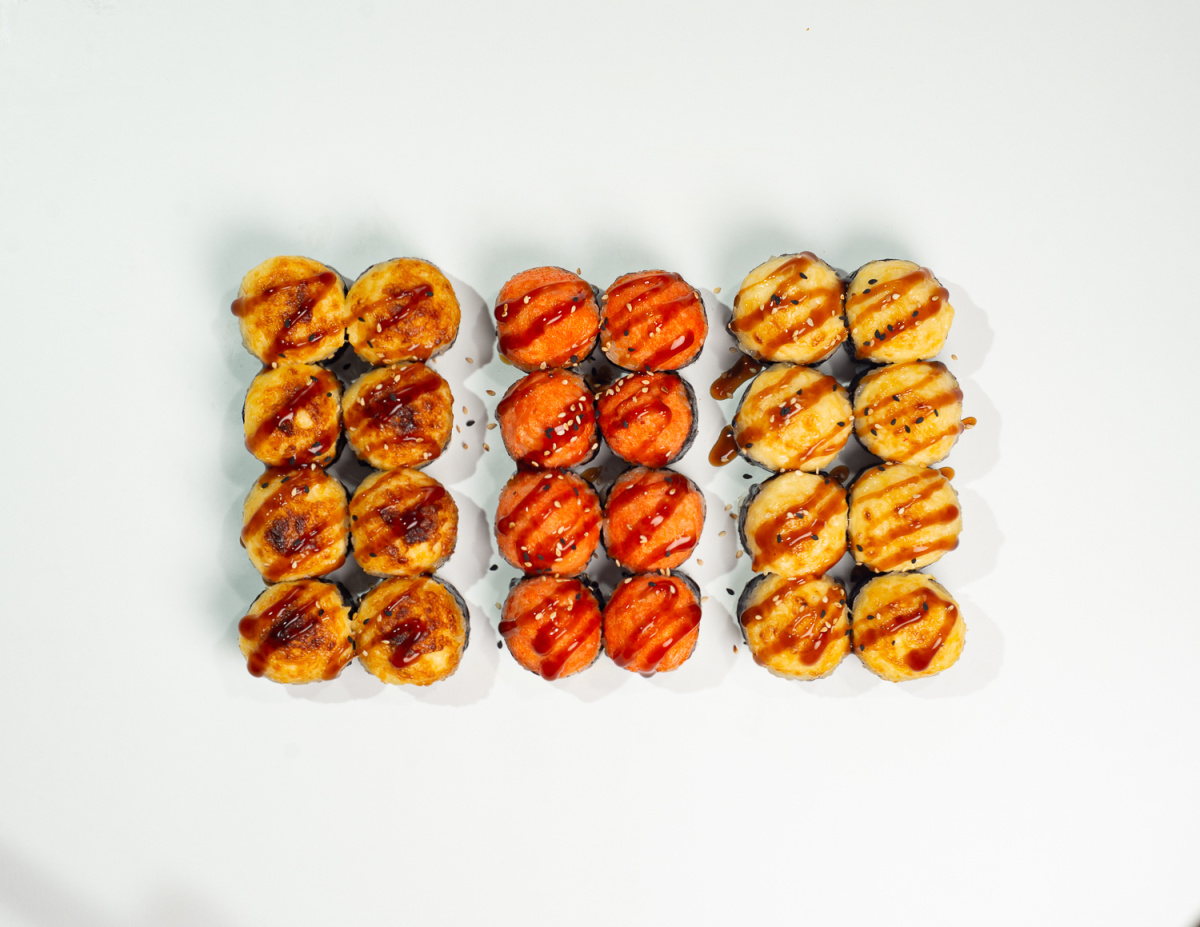 Запечённый с копчёным лососем, луком и соусом унаги (8шт)