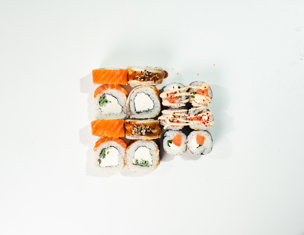 Малый ролл копчёный лосось, зелёный лук, сыр (6шт)
