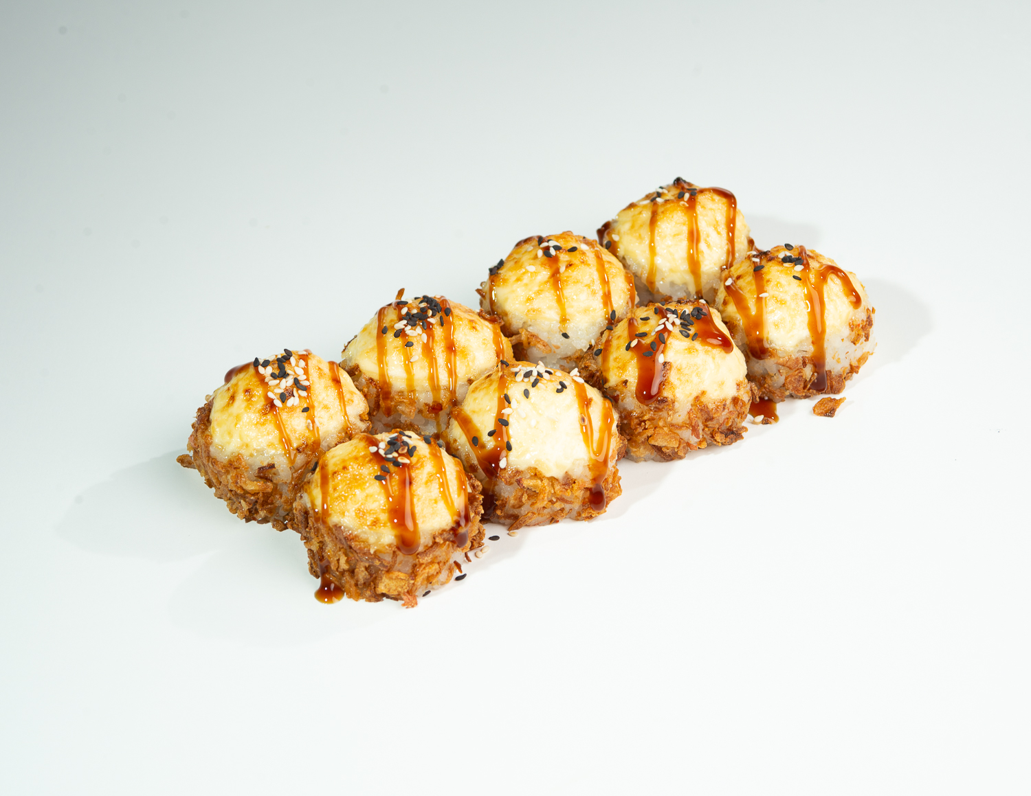 Рис, нори, творожный сыр, копчёная курица, огурец, жареный лук, шапка: сырный замес, соус унаги, кунжут