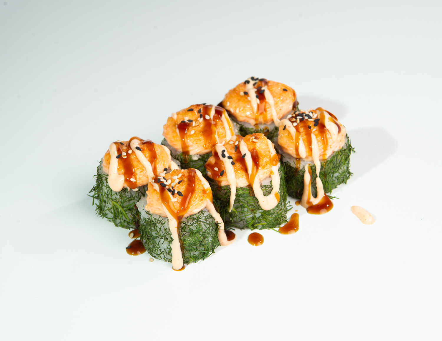 Рис, нори, укроп, копчёная курица, творожный сыр, огурец, шапка: яки сосус, соус унаги,  соус спайси, кунжут