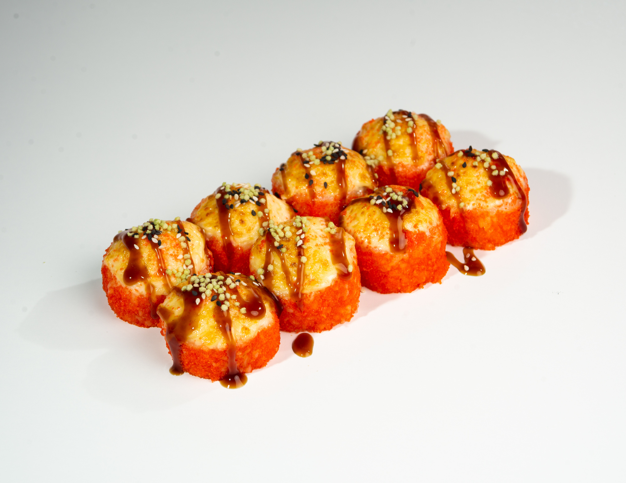 Рис, нори, омлет, творожный сыр, икра тобико, шапка: сырный замес,  соус унаги, кунжут