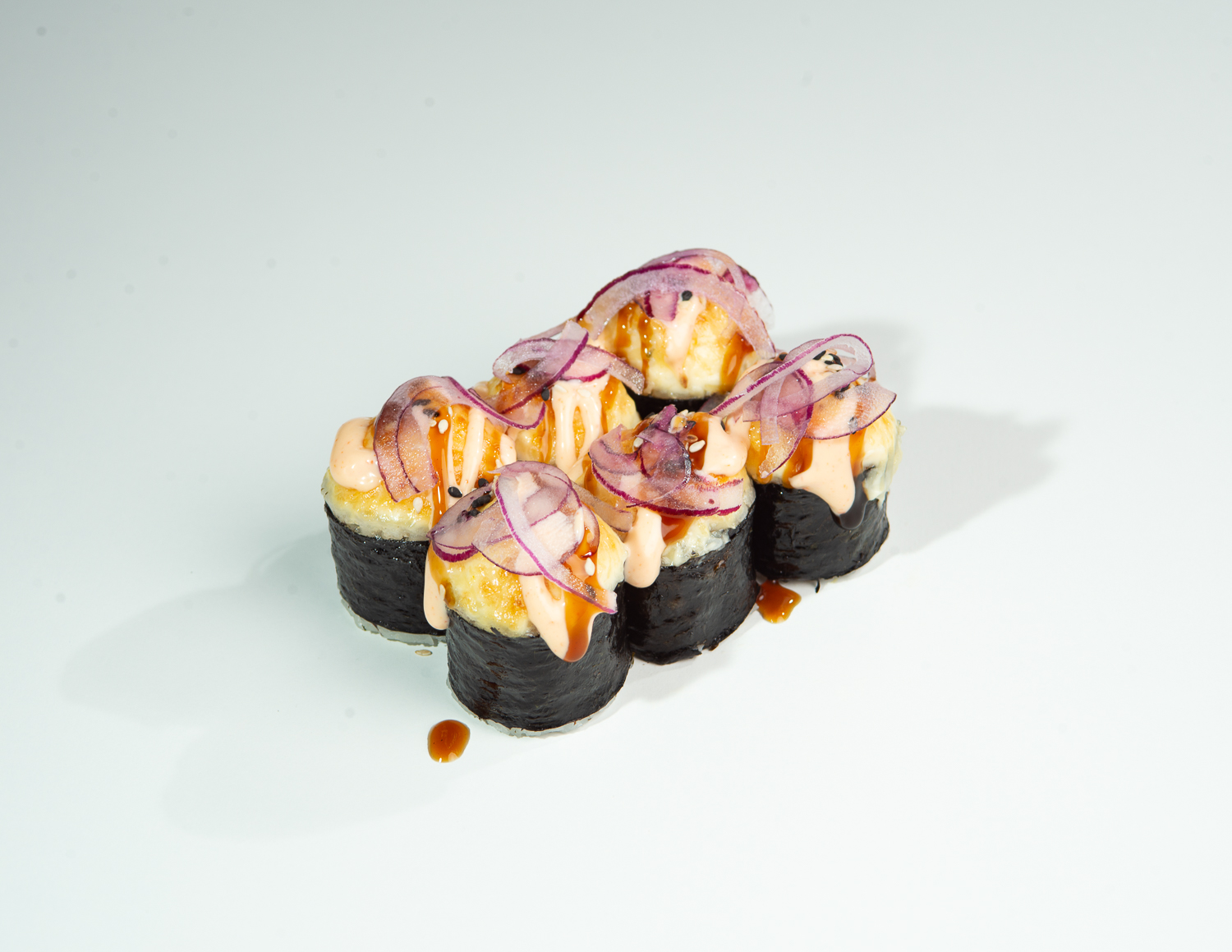 Рис, нори, копчёный лосось, творожный сыр, огурец, шапка: сырный замес, соус унаги, соус спайси, маринованный лук, кунжут