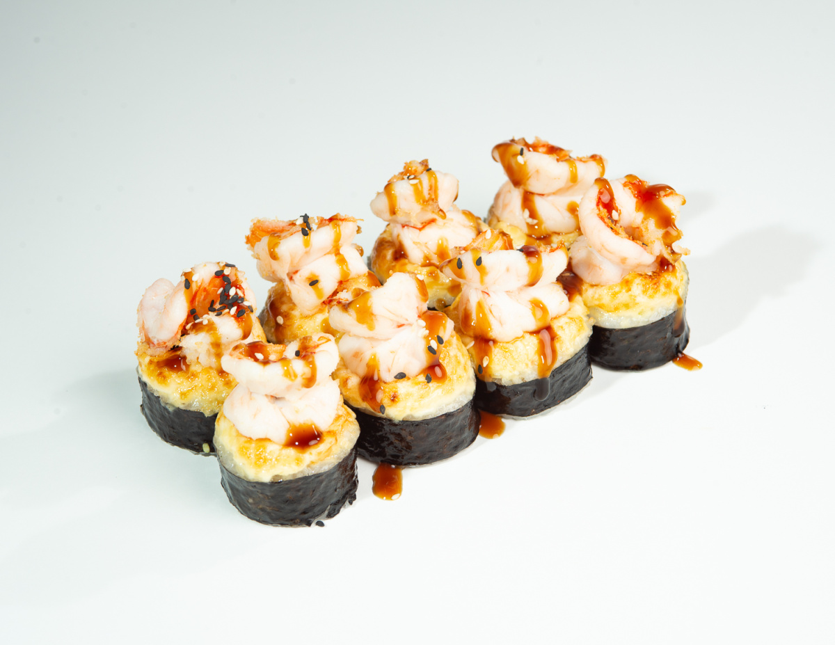 Рис, нори, авокадо, лосось, омлет, шапка: креветка, сырный замес, соус унаги, кунжут