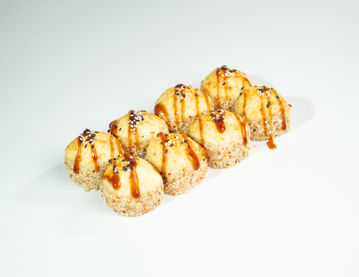 Рис, нори, творожный сыр, копчёная курица, листья салата, шапка: сырный замес, соус унаги, кунжут