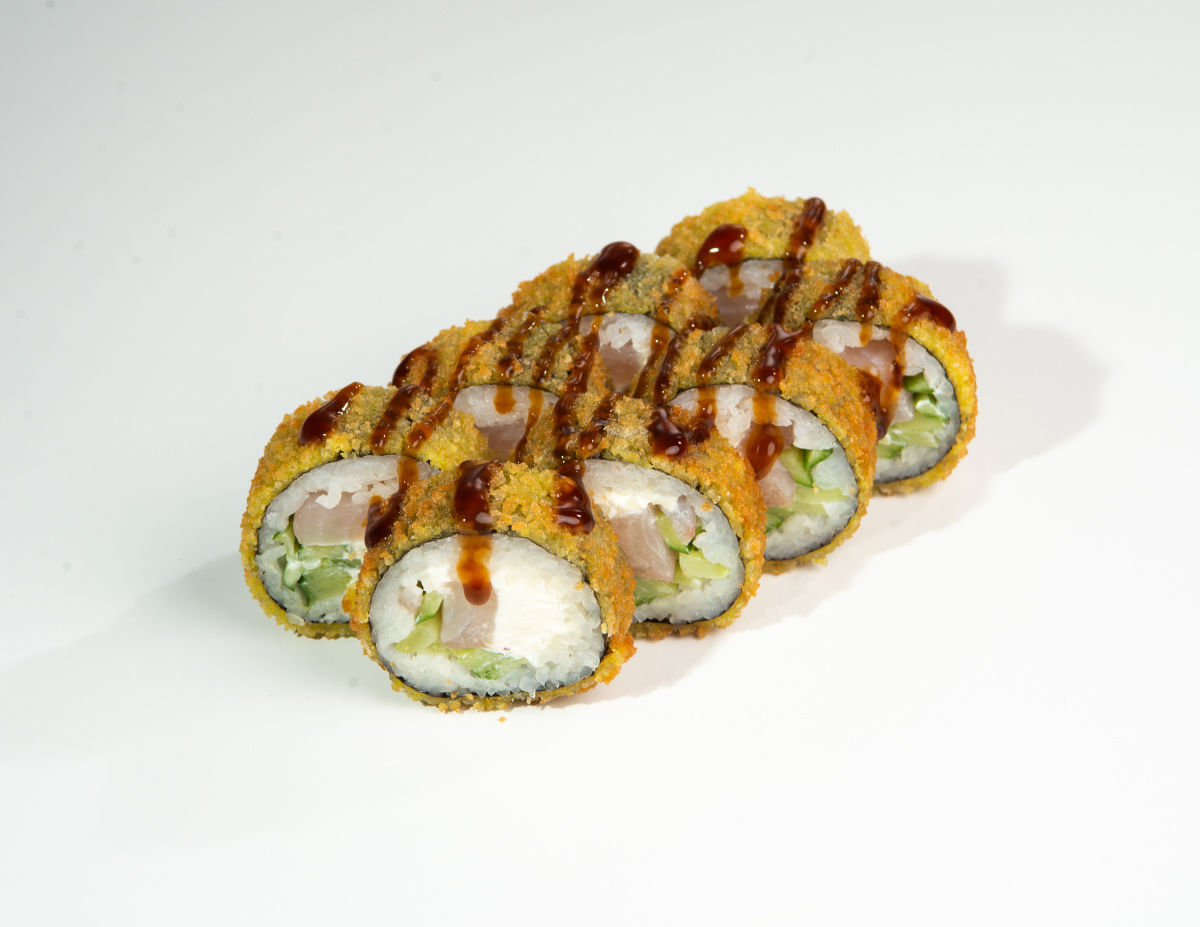 Рис, нори, морской окунь, творожный сыр, огурец, кляр, сухари панко, соус унаги