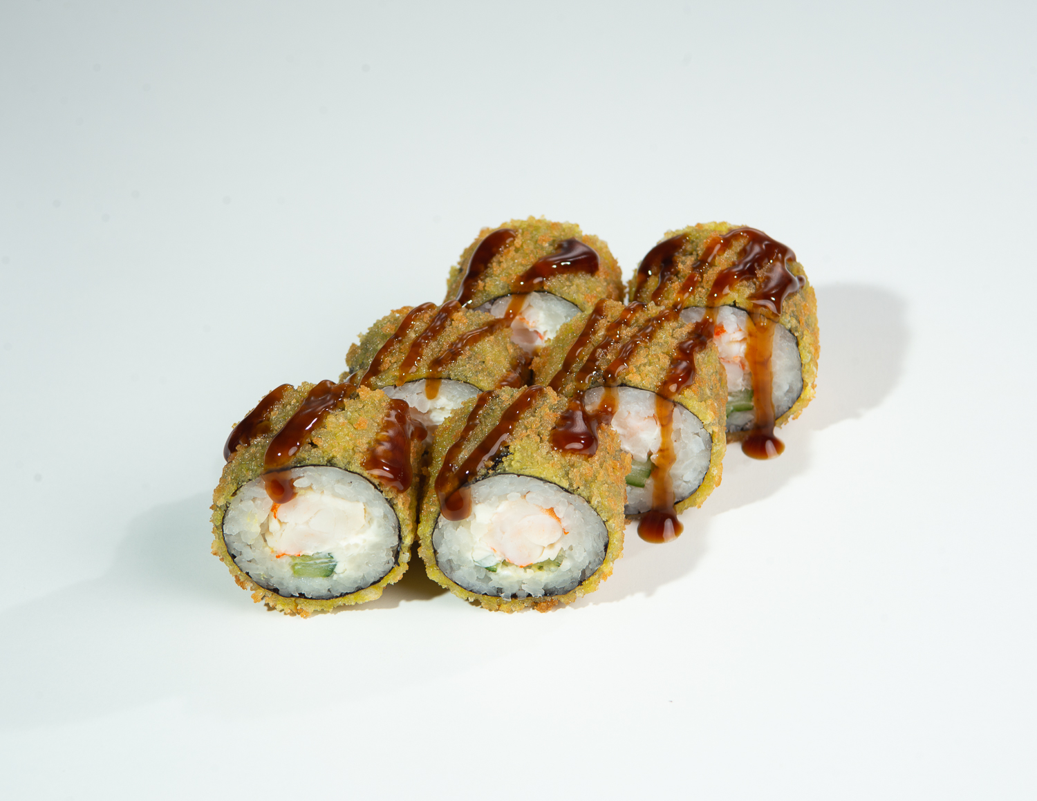 Рис, нори, кляр, панировочные сухари, творожный сыр, огурец, креветка, соус унаги