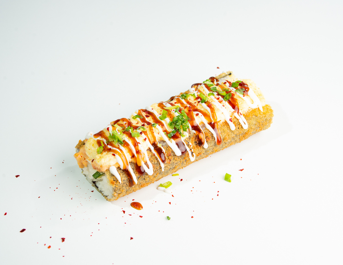 Рис, нори, огурец, творожный сыр, замес: лосось, соус спайси, сырный замес, зелёный лук, соус унаги, соус ранч, посыпка чили